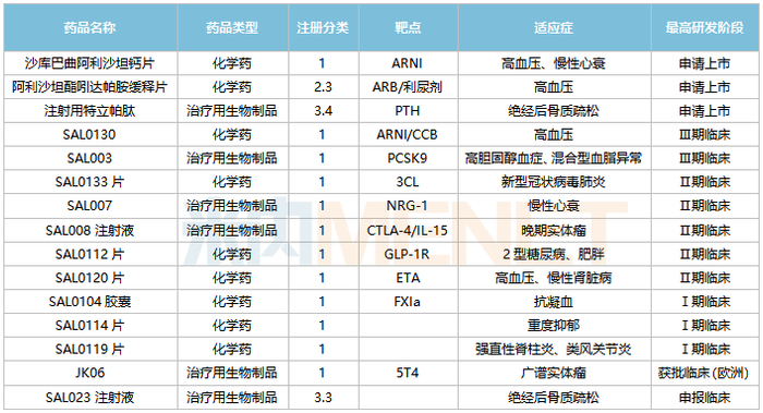 15款新药中,沙库巴曲阿利沙坦钙片、阿利沙坦酯吲达帕胺缓释片、注射用特立帕肽已提交上市申请;SAL0130、重组全人源抗PCSK9单克隆抗体注射液(SAL003)已处于Ⅲ期临床研究阶段,上市可期!