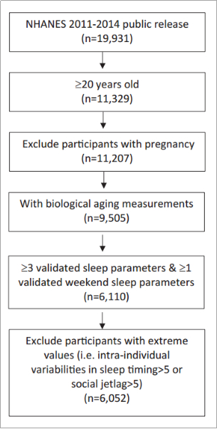 该研究依托美国国家健康和营养检查调查(NHANES)2011-2012年和2013-2014年两个周期的数据,共纳入6052名受试者,平均年龄49.7岁,女性占比52.5%,被选中的受试者具有以下特征:(1)有效的生物衰老测量值;(2)至少 4 天的有效加速度计记录,且至少有 1 天来自周末;(3)睡眠不规则性和社会时差< 5。