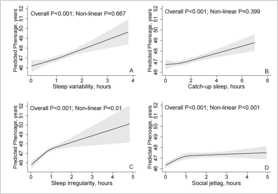 进一步研究显示,睡眠变异性越大、补觉越多、睡眠不规则性越大和社会时差越多,与生物衰老测量指标越“老”显著相关,而测量值更“老”表示发病、残疾和死亡的风险较高,生物衰老更明显。