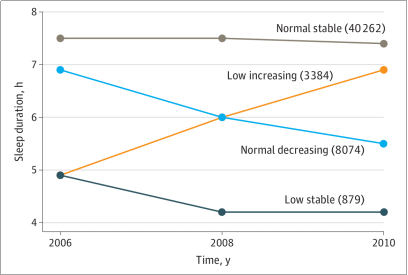 研究人员将受试者4年间的睡眠时长轨迹进行分类,共分为四种轨迹模式:正常稳定组(睡眠时长7.4-7.5小时)、正常下降组(睡眠时长从7.0小时降至5.5小时)、低增加组(睡眠时长从4.9增至6.9小时)、低稳定组(睡眠时长4.2-4.9小时)。