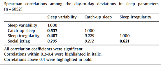 同时,研究发现多个睡眠不规律的参数之间有明显的关联:比如睡眠时间和周末补觉的情况密切相关,以及睡眠时间的不确定性和社会时差(工作日与休息日睡眠时间的差别)也有很强的关联。