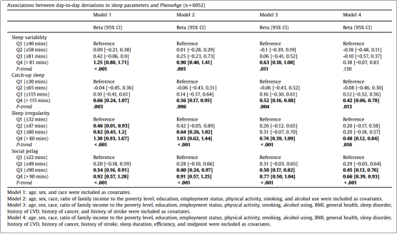 这不,近日,来自美国奥古斯塔大学的研究团队就在睡眠研究领域知名期刊Sleep Health发表了一篇研究论文,题目为“Day-to-day deviations in sleep parameters and biological aging: Findings from the NHANES 2011-2014”。该研究显示,较大的睡眠变异性、较大的睡眠不规则性、更多的补觉、以及更多的社交时差,都与生物衰老显著相关。并且,睡眠的日际偏差可能是加速生物衰老的重要因素。