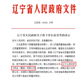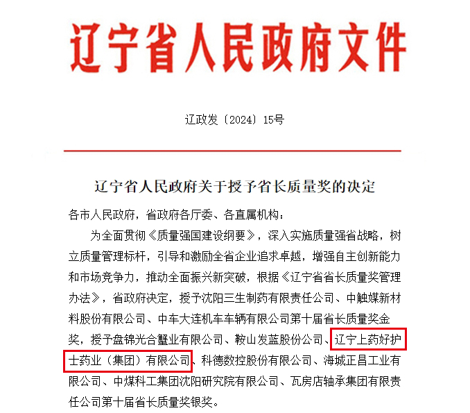 2024年9月10日,辽宁省人民政府发布《辽宁省人民政府关于授予省长质量奖的决定》(辽政发〔2024〕15号),3家单位获第十届省长质量奖金奖,7家单位获银奖。其中,辽宁上药好护士药业(集团)有限公司作为本溪市唯一一家入选企业,获得第十届省长质量奖银奖。