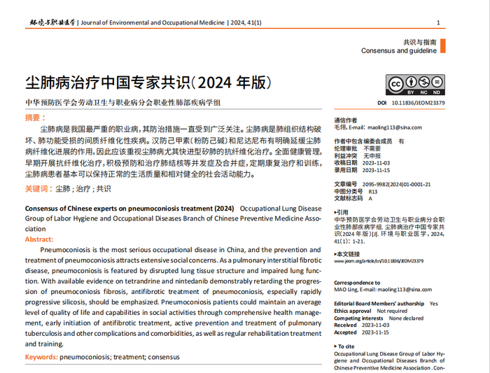 2024年,中华预防医学会劳动卫生与职业病分会职业性肺部疾病学组在《环境与职业医学》上发布了《尘肺病治疗中国专家共识(2024年版)》。