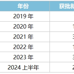 米内网数据显示,2019至2024上半年获批上市的国产1类新药(指首次获批,含1.2、1.4、1.5等,不含预防用生物制品及中成药提取物)有128个,其中化学药占79个,中成药占17个,治疗用生物制品占32个。