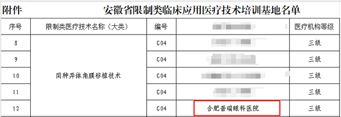 5月11日,安徽省卫生健康委公布全省“限制类临床应用医疗技术”培训基地备案名单,合肥普瑞眼科医院“同种异体角膜移植技术”培训基地成功获得备案认证,取得开展相应限制类技术的培训资质,可按照相关技术规范化培训标准招收学员进行培训及考核,为医疗机构培养输送更多专业技术人才。本次获批备案的安徽省限制类临床应用医疗技术培训基地包括10家三级医院,合肥普瑞眼科医院是其中唯一的民营三级医院,彰显了医院的专业实力和综合影响力。