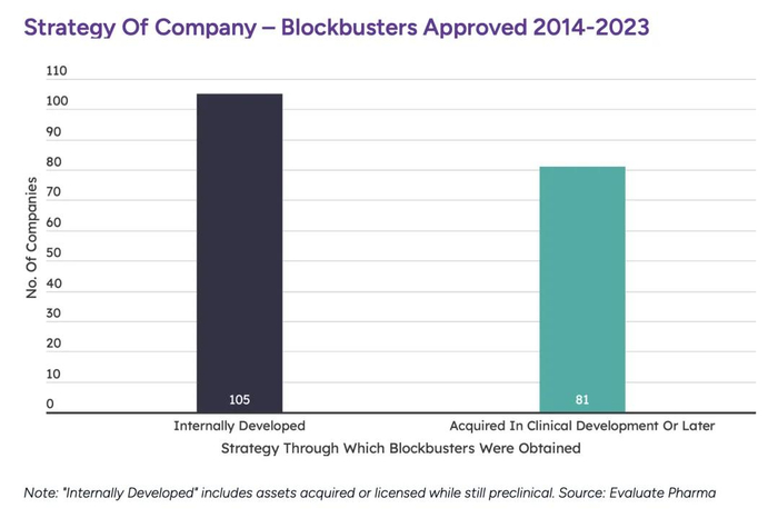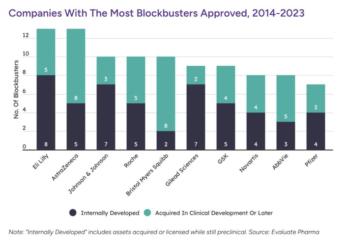 其中,收购公司最受欢迎。过去10年里,有49家被收购药企的产品达到了“重磅炸弹”门槛,或者虽然仍在临床试验阶段但预计会成为“重磅炸弹”。