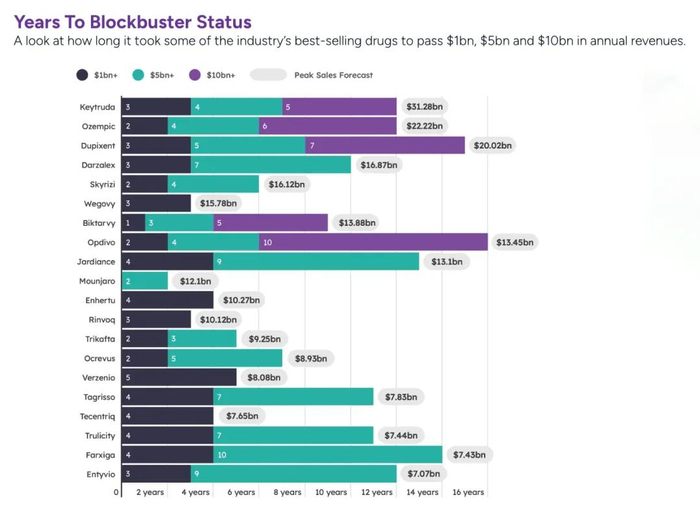 所以,Evaluate Pharma的“重磅炸弹”成长期分析,排除了礼来2023年12月才推出的肥胖症药物Zepbound。分析也不包括COVID-19产品和吉利德的丙肝药物Harvoni,因为它们的放量轨迹并不典型。