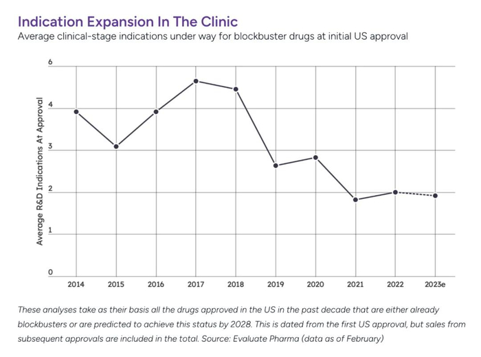 Evaluate Pharma的预测也呈下降趋势。对于2019年及以后批准的药物,五年内补充批准适应症数量平均值从2.5个,降至2023-2028年的预测值1.8个。