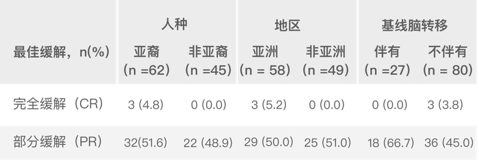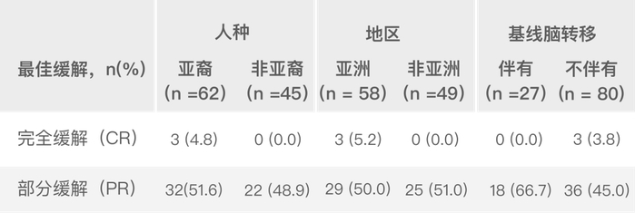 经IRC评估的不同亚组最佳ORR,无论人种、地区、基线疾病特征和既往治疗史,均显示良好的抗肿瘤疗效,与全球整体人群最佳ORR获益一致