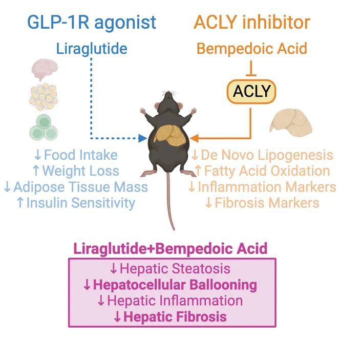 Fig.4 Combining an inhibitor of liver ACLY, bempedoic acid, and the GLP-1R agonist liraglutide reduces liver steatosis, hepatocellular ballooning, and hepatic fibrosis in a mouse model of MASH[8].