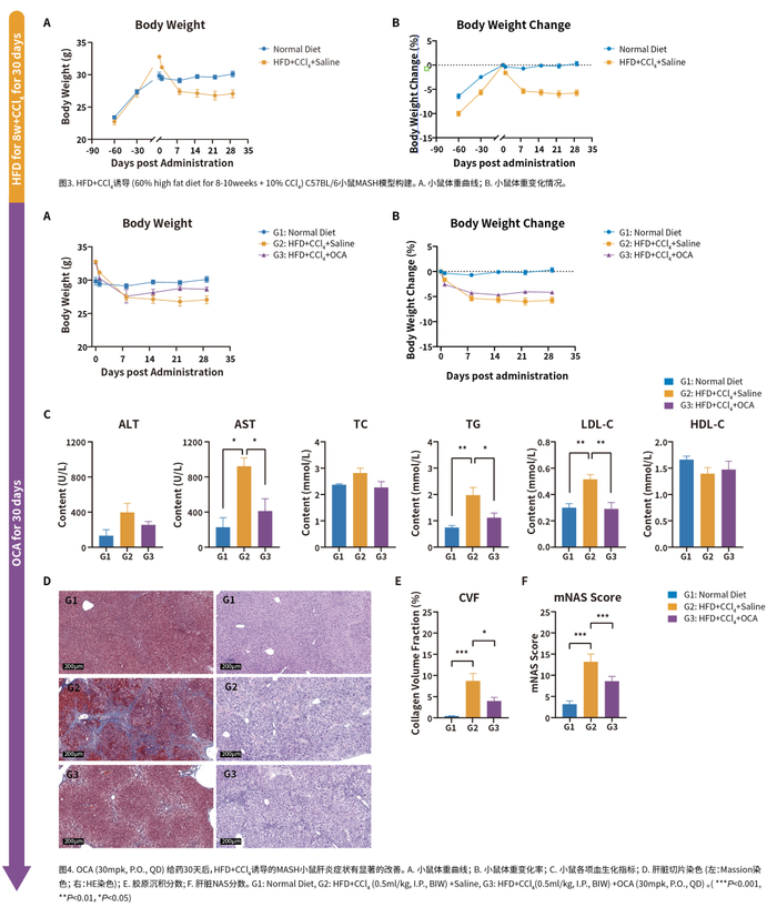 HFD+CCL4模型的构建由两部分组成:首先是高脂饮食(High-Fat Diet,HFD)单独诱导肝脂肪变性以及炎症反应,然后在HFD的基础上用CCL4诱导肝纤维化。
