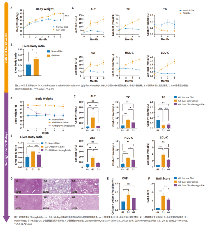 GAN(Gubra-Amylin NASH)饮食是一种经过改良、无反式脂肪的高脂高胆固醇高果糖饲料,其诱导的MASH动物模型更好地模拟了人类疾病的发生,在生理、代谢和组织病理学方面有良好的转化性。