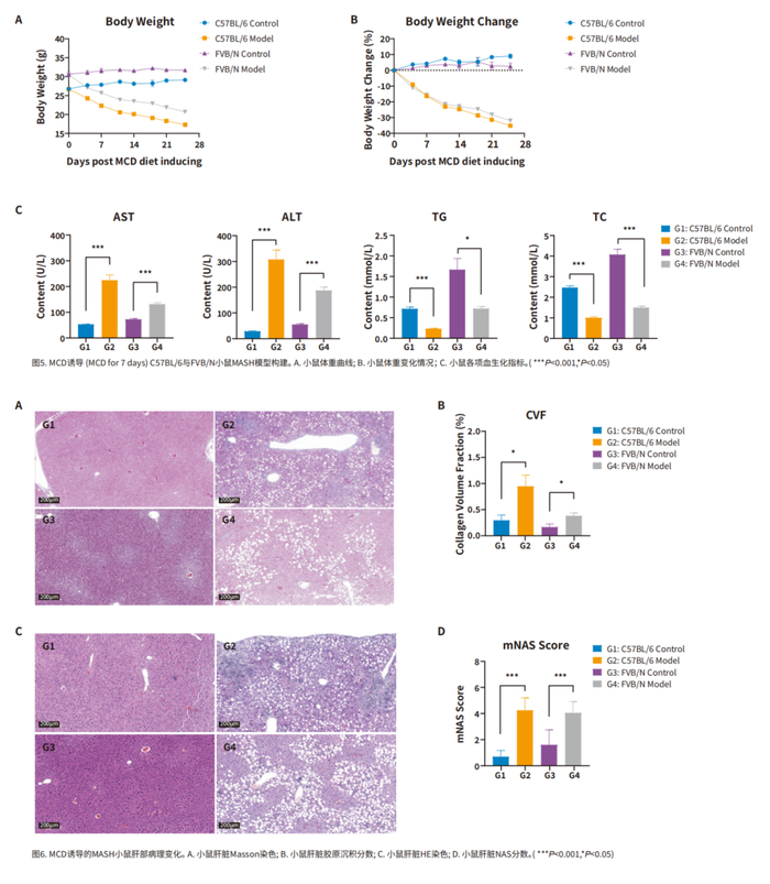 甲硫氨酸和胆碱缺乏饮食(Methionine‒Choline-Deficient Diet,MCD)含有21%脂肪,63%蔗糖为主的碳水化合物,缺乏胆碱和甲硫氨酸,该饮食方案可通过引起肝脏脂类的输出障碍从而驱动肝损伤。MCD模型在较短的时间内即可表现出MASH和肝纤维化。
