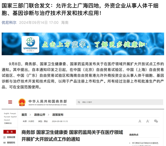 另一个是9月7日,商务部、国家卫生健康委、国家药监局联合发布《关于在医疗领域开展扩大开放试点工作的通知》,其中指出在北京、上海、广东自贸区和海南自由贸易港,允许外商投资企业从事人体干细胞、基因诊断与治疗技术开发和技术应用,以用于产品注册上市和生产。所有经过注册上市和批准生产的产品,可在全国范围使用。