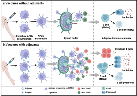 带有佐剂的疫苗促进更多APC的成熟,增加APC与T细胞之间的相互作用,促进更多数量和更多类型的T辅助极化细胞因子、多功能T细胞和抗体的产生,导致广泛和持久的免疫,以及减少剂量和抗原的使用。