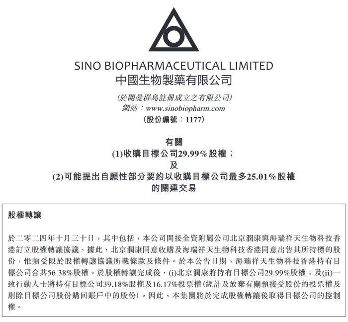 10月30日晚间,中国生物制药公告宣布,将通过协议转让及要约收购的方式,收购科创板上市公司江苏浩欧博生物医药股份有限公司最多55%的股权,并实现对后者的控股。