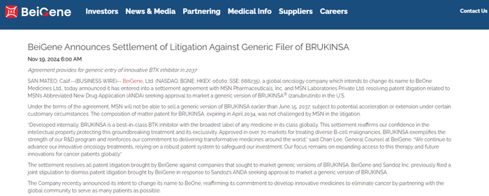 根据和解协议,百济神州授予MSN不早于2037年6月15日在美国销售BRUKINSA仿制药的权利,但根据此类和解的惯例,可能会加速或延期。同时,双方已向法院提交一份共同约定撤回该诉讼,并将向美国联邦贸易委员会和美国司法部提交和解协议。