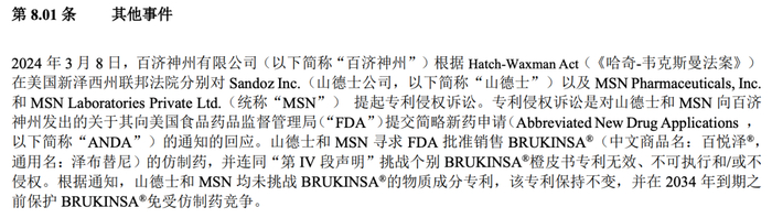 2024年3月,百济神州宣布在美国新泽西州联邦法院分别对山德士和MSN提起专利侵权诉讼,这是对两家公司向百济神州发出的关于其向美国FDA提交ANDA的通知的回应。据悉,山德士和MSN寻求FDA批准销售BRUKINSA的仿制药,并连同“第IV段声明”挑战个别BRUKINSA橙皮书专利无效、不可执行和/或不侵权。