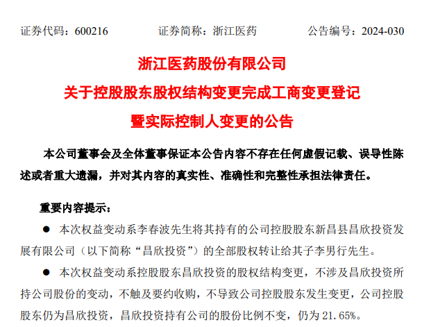 12月22日晚,浙江医药发布公告:公司实际控制人已变更为李男行先生,其父李春波仅直接持有公司0.01%股份。