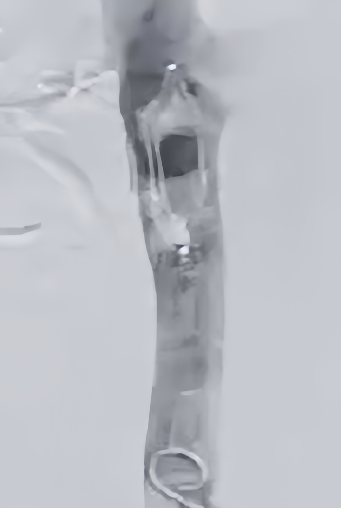 患者取仰卧位,在局部麻醉下通过左侧足背静脉顺行造影,结果显示左侧髂股静脉血栓负荷较重。随后,经右侧股静脉入路,成功置入血栓保护装置于下腔静脉预期位置,确保术中脱落的血栓能够被有效拦截。之后,再经左侧腘静脉入路,对髂股静脉狭窄区域依次进行血栓清除术和球囊扩张术,并成功植入髂静脉支架。术后造影显示,左侧髂股静脉血流恢复通畅,同时血栓保护装置内见少量血栓充盈缺损,随后经右侧股静脉负载血栓回收血栓保护装置,并将其撤出体外,取出后可见拦截到的不同尺寸的血栓,手术顺利完成。