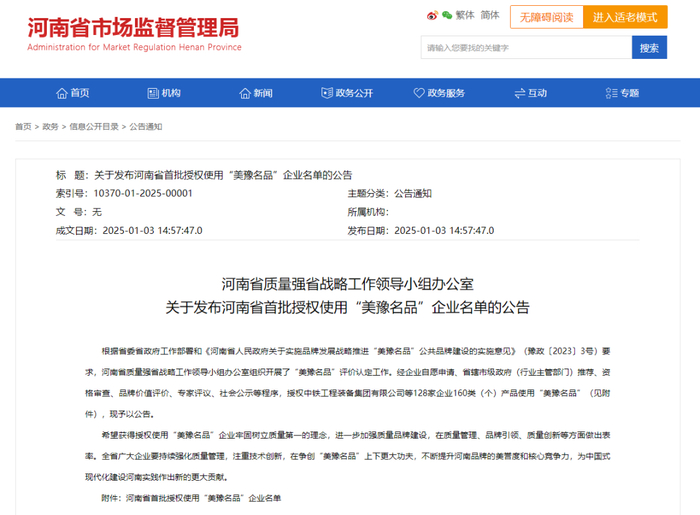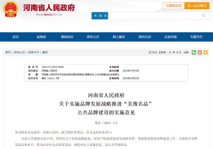 2023年,河南省政府印发《关于实施品牌发展战略推进“美豫名品”公共品牌建设的实施意见》,旨在以“美豫名品”公共品牌建设为抓手,不断提升河南品牌的美誉度和核心竞争力,加快质量强省、品牌强省、标准河南建设,为现代化河南建设提供有力的品牌支撑。