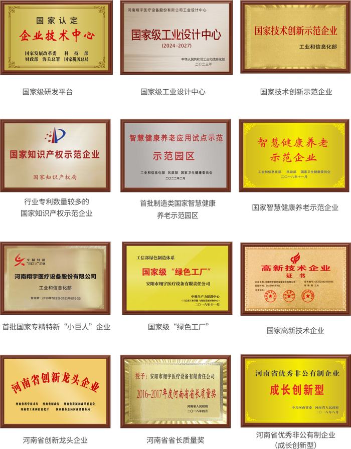 作为国家高新技术企业、国家技术创新示范企业、国家“专精特新”小巨人企业、国家级绿色工厂,翔宇医疗以“打造世界级康复航母,为生命和祖国奉献”为企业使命,始终坚持“优良装备,品质服务”的竞争策略,协助各地打造覆盖全人群、全病种、全生命过程的智慧康养服务保障体系,取得了令人瞩目的成就,在品牌建设方面荣获了“河南省省长质量奖”、“河南省质量标杆”等荣誉称号。