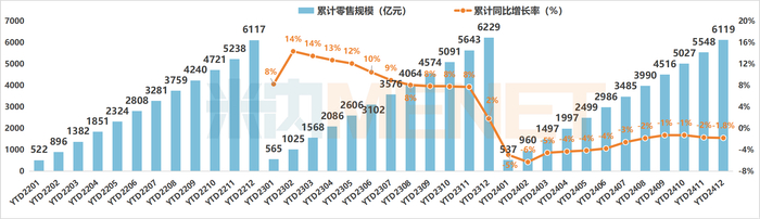 2024年1-12月中国实体药店市场累计零售规模及变化趋势