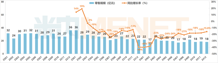 2024年12月中国实体药店保健品零售规模为18亿元,规模较上月略有回落。与2023年同期相比,仍有接近16%的降幅,市场仍在低迷阶段。