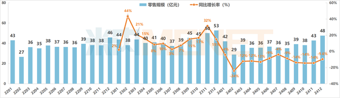 2024年12月中国实体药店中药饮片零售规模为48亿元,较11月增长11.2%,与2023年同期相比,还是有9.6%的降幅,但与11月的同比增速相比,降幅有所收窄。