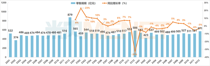 2024年12月中国实体药店保健品零售规模及变化趋势