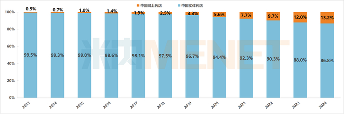 2013-2024年中国零售终端实体药店和网上药店药品销售规模占比