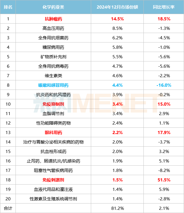 2024年12月中国实体药店化学药TOP20品类份额及增长趋势