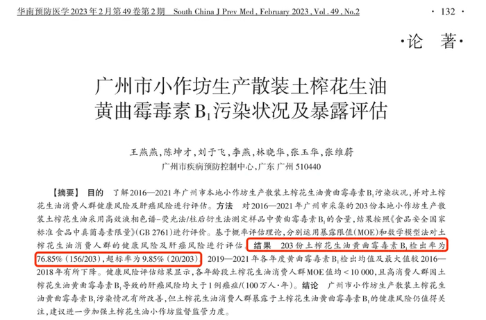 像下面这个研究,对广州小作坊生产的 203 土榨花生油进行了检测,结果 76.85% 检出了黄曲霉毒素,而且 9.85% 还超标了。