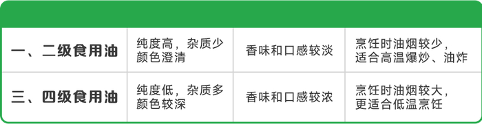食用油分为一级、二级、三级、四级(橄榄油是个特例,分为初榨橄榄油:特级、中级、精炼、混合)