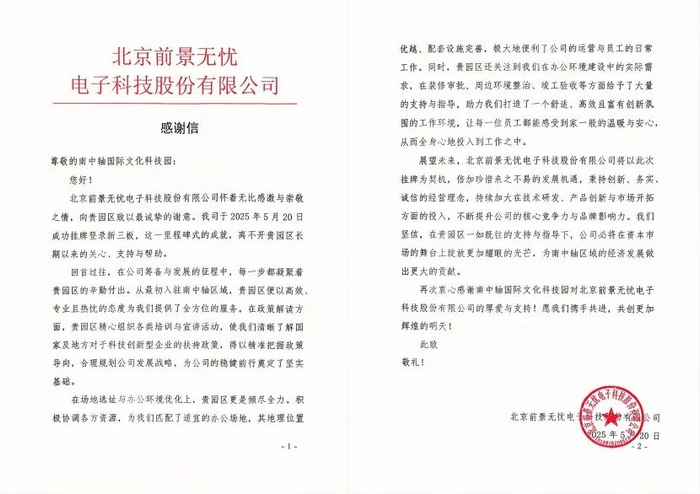 “从最初入驻南中轴区域,贵园区便以高效、专业且热忱的态度为我们提供了全方位的服务。在政策解读方面,贵园区精心组织各类培训与宣讲活动,使我们清晰了解国家及地方对于科技创新型企业的扶持政策,得以精准把握政策导向,合理规划公司发展战略,为公司的稳健前行奠定了坚实基础。在场地选址与办公环境优化上,贵园区更是倾尽全力。积极协调各方资源,为我们匹配了适宜的办公场地,其地理位置优越、配套设施完善,极大地便利了公司的运营与员工的日常工作。同时,贵园区还关注到我们在办公环境建设中的实际需求,在装修审批、周边环境整治、竣工验收等方面给予了大量的支持与指导,助力我们打造了一个舒适、高效且富有创新氛围的工作环境,让每一位员工都能感受到家一般的温暖与安心,从而全身心地投入到工作之中。”挂牌当天,前景无忧向南中轴国际文化科技园发来感谢信。