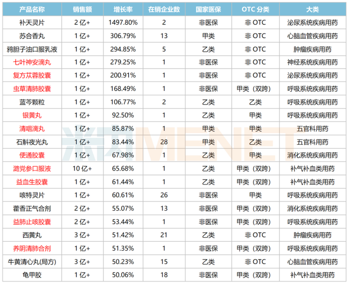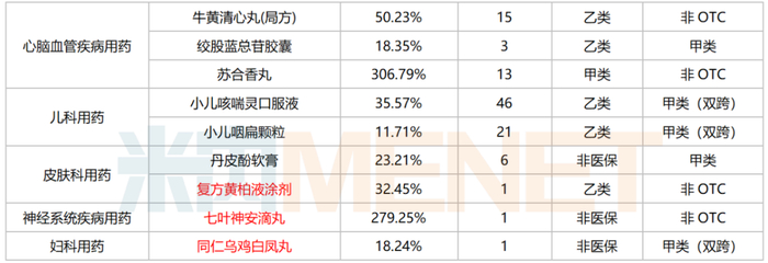 78个中成药中有20个涨幅超过50%,其中7个为翻倍式增长(增速超过100%),包括补天灵片、苏合香丸、鸦胆子油口服乳液、七叶神安滴丸(云南金七制药独家)、复方苁蓉胶囊(广东罗浮山国药独家)、虫草清肺胶囊(国药普兰特独家)及蓝芩颗粒。