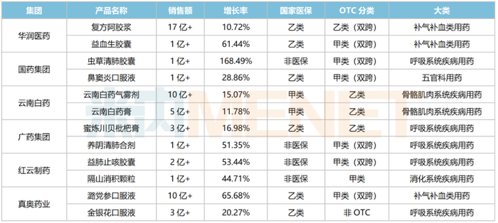 10个超5亿中成药涵盖3个治疗大类,其中有5个为呼吸系统疾病用药(4个感冒用药、1个清热解毒用药),3个为补气补血类用药(1个补血用药、2个补气用药),2个为骨骼肌肉系统疾病用药(均为消肿止痛用药)。