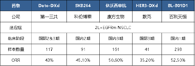 对比此前公布的小样本Ⅱ期EGFRm NSCLC数据来看,在更大样本量下ORR和mPFS数字有所下降,但非头对头数据比较显示芦康沙妥珠单抗在EGFRm NSCLC疗效数据仍优于第一三共的Dato-DXd(43%)以及默克的HER3-DXd(35.2%)。需要关注的是,国产竞品数据表现同样亮眼,康方生物的依沃西单抗联合化疗在对应适应症的ORR达50.6%,百利天恒的BL-B01D1在对应适应症的临床Ⅰ期试验中的ORR达52.5%。