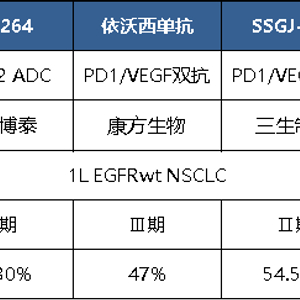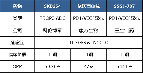 非头对头对比,芦康沙妥珠单抗联合PD-L1一线治疗EGFR野生型nsqNSCLC疗效有优于两款PD-1/VEGF双抗单用疗法。其中,三生制药SSGJ-707在对应适应症中的ORR为54.5%,康方生物的依沃西单抗在对应适应症中的ORR为47%。