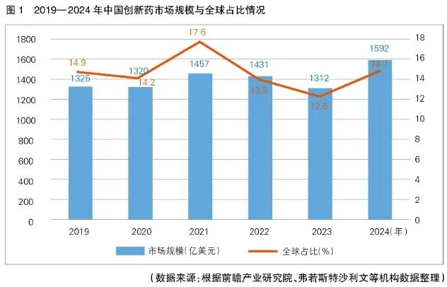 同时,综合前瞻产业研究院、弗若斯特沙利文等机构数据,我国创新药市场规模由2019年的1325亿美元增至2024年的1592亿美元(详见图1),在全球占比总体保持在15%左右;据预测,2030年中国创新药市场规模有望突破3000亿美元,全球占比继续提升。