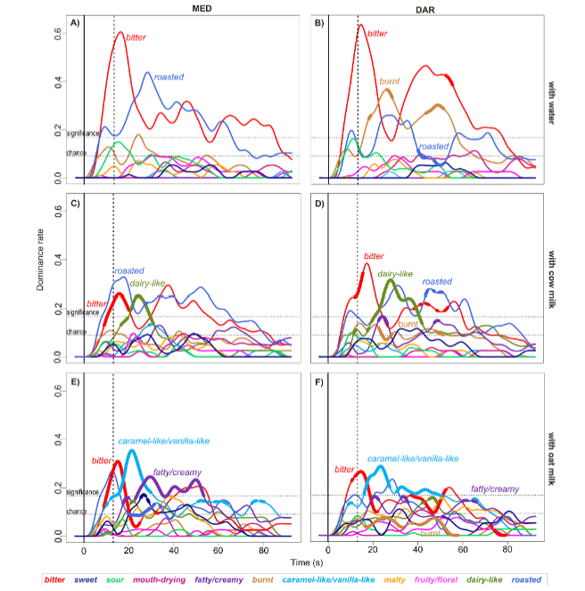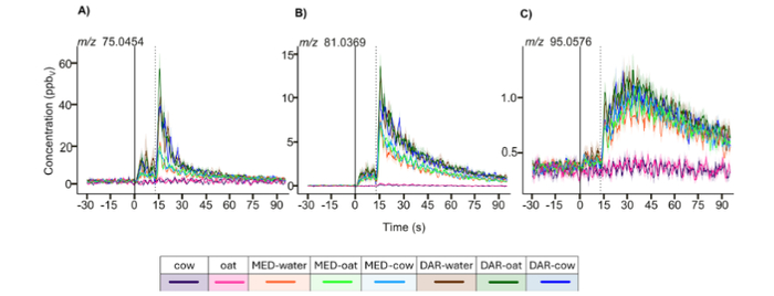 基于此,来自德国弗劳恩霍夫研究所和意大利埃德蒙·马赫基金会的研究团队,以中度和深度烘焙的阿拉比卡咖啡为研究对象,对比了添加牛乳与燕麦奶(30%重量比)对香气释放和动态味觉感知的影响。研究运用“动态感官主导性”(TDS)方法,追踪饮用过程中主导味觉的变化,同时通过质子转移反应质谱(PTR-MS)实时监测鼻腔呼出气体中的47种挥发性物质,首次在真实饮用场景中揭示了咖啡与牛奶的风味交互机制。