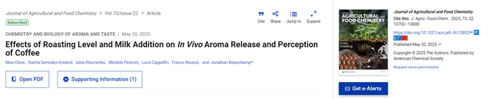 Cleve N, Gonzalez-Estanol K, Khomenko I, et al. Effects of Roasting Level and Milk Addition on In Vivo Aroma Release and Perception of Coffee. J Agric Food Chem. 2025;73(22):13792-13808. doi:10.1021/acs.jafc.4c12852
