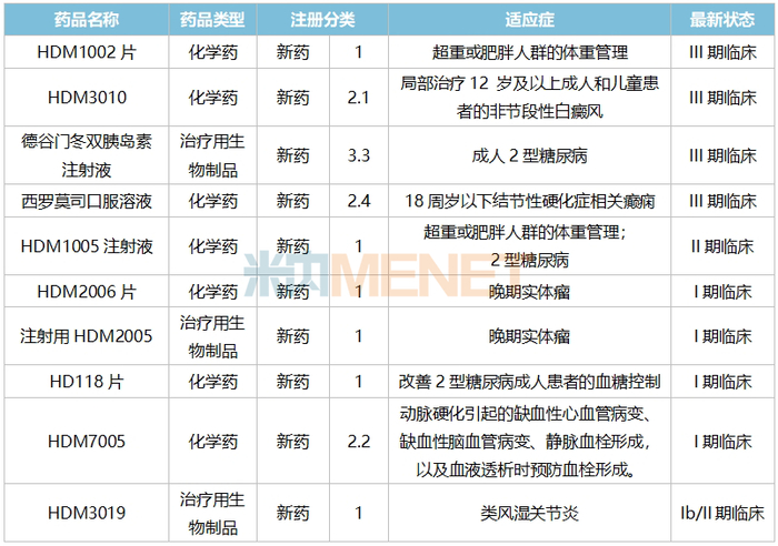目前中美华东进展较快的新药集中在化药和生物药领域:HDM1002片用于超重或肥胖人群的体重管理的III期临床在2025年4月启动;HDM1005注射液用于超重或肥胖人群的体重管理的II期临床和2型糖尿病II期临床分别在2025年1月、3月启动;HDM7005用于动脉硬化引起的缺血性心血管病变、缺血性脑血管病变、静脉血栓形成,以及血液透析时预防血栓形成的I期临床也在2025年一季度启动了;HDM3019在2025年5月启动用于类风湿关节炎的Ib/II期临床。