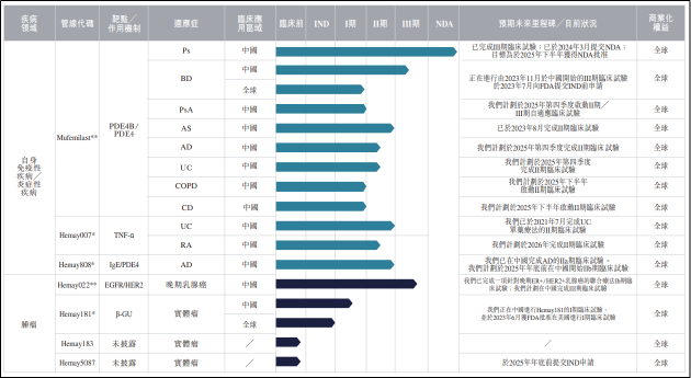 和美药业核心产品包括小分子磷酸二酯酶4B(PDE4B)蛋白表达阻断剂和PDE4抑制剂Mufemilast、EGFR/HER2双靶点小分子抑制剂Hemay022。其中,Mufemilast作为单一疗法治疗银屑病的关键性III期临床试验已完成,并于2024年3月提交NDA,预期Mufemilast将于2025年下半年取得国家药监局的上市批准。