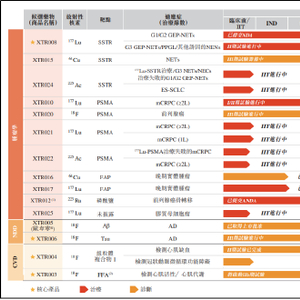 其中,XTR008是一种处于注册阶段的177Lu标记生长抑素受体(SSTR)靶向的放射配体,用于神经内分泌肿瘤的治疗。XTR006是一种18F标记的微管蛋白相关单元(tau)靶向的PET诊断用放射性配体,用于诊断疑似阿尔茨海默病或AD痴呆引起的轻度认知功能障碍。XTR004是一种18F标记的线粒体复合体I靶向的诊断用放射性配体,用于PET-心肌灌注成像。XTR003是一种18F标记的PET诊断用放射性配体,用于心肌脂肪酸代谢成像,以检测心肌存活性。