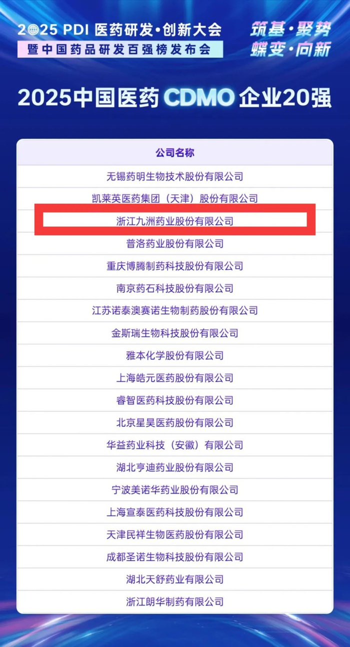 6月20日,《2025中国药品研发实力排行榜》系列榜单在重庆重磅发布。九洲药业凭借硬核技术实力与全球化服务优势,再度跻身年度“中国医药CDMO企业20强”,同时荣获“2025中国化药研发实力排行榜Top100”,以双项荣誉夯实公司在医药研发生产服务领域的领先地位。