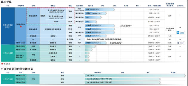 其中,核心产品MVR-T3011是一种基于HSV-1病毒的新型溶瘤免疫疗法,通过将强效的肿瘤裂解与表达抗PD-(L)1抗体和IL-12相结合,靶向治疗全谱系膀胱癌及包含头颈鳞癌的更广泛实体瘤类型。目前,MVR-T3011针对卡介苗无应答型NMIBC的全球多中心临床试验已进入临床Ⅱ期,国内针对头颈鳞癌及其他实体瘤适应症的临床试验也已进展至Ⅰ/Ⅱa期。