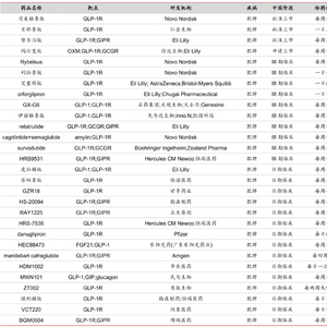 从竞争格局看,目前国内GLP-1产品的竞争格局非常激烈,国内已有约40家企业的GLP-1药物进入减重适应症临床开发阶段,包括针对GLP-1单靶点、GLP-1/GIP双靶点、GLP-1R/GCGR/GIPR三靶点、GLP-1R/GCGR/FGF21R三靶点等的多肽、小分子、融合蛋白等多个药物形式。