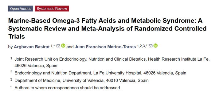 [5]Basirat, A.; Merino-Torres, J.F. Marine-Based Omega-3 Fatty Acids and Metabolic Syndrome: A Systematic Review and Meta-Analysis of Randomized Controlled Trials. Nutrients 2025, 17, 3279.